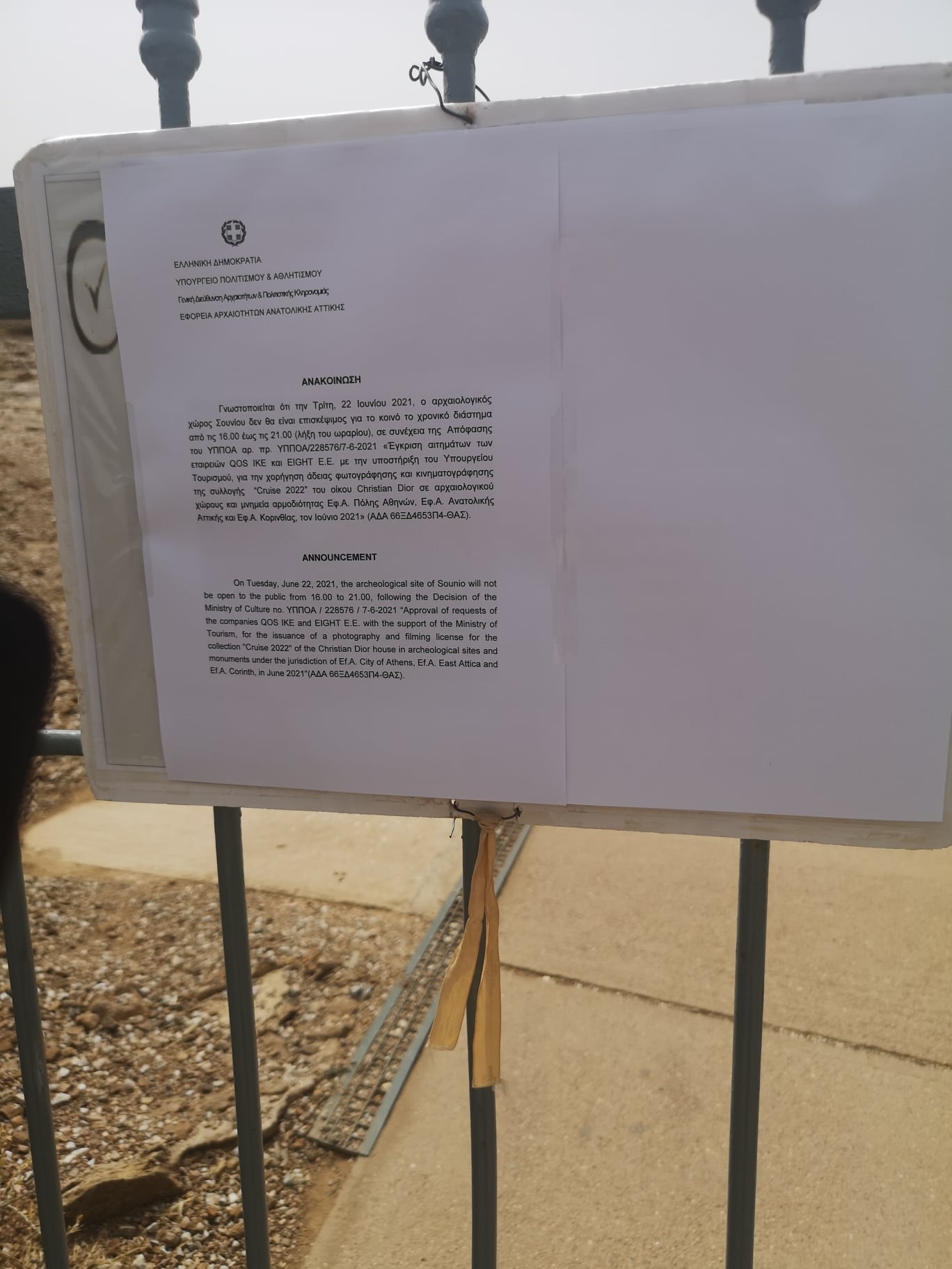 Figure 2: The announcement that the Sounio temple will not be open to the public due to the photoshoot. Photo: D. Dalakoglou.