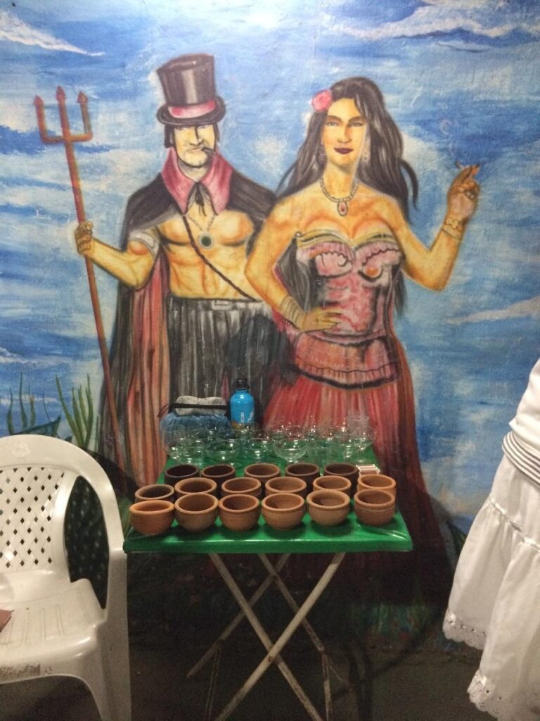 I was intrigued by Catarina’s attention to the atmospheric qualities of protection. Like other Umbanda practitioners whom I spoke to, Catarina spoke about the protection offered by the center as a material and embodied reality where the dangers of the street were temporarily kept at bay. This is a material and embodied reality that emerges through a series of ritual practices that involve an interplay between objects, bodies, and spirit entities, amongst other things. I offer two examples to illustrate the interplay between these different materialities inside the center.