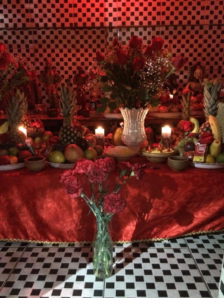 Inside the altar of the povo, a faint red light revealed a row of thirteen statues, representing particular spirits worshipped in the center. Twice a year, the povo receive an extensive offering (oferenda) from the spirit mediums to request guidance and protection for themselves or on behalf of a friend or a family member.
