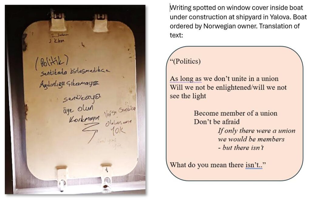 Under such conditions, it is difficult for workers to cooperate and organize. It also does not help that laws and regulations in Turkey make effective union organizing in this sector difficult. There are two active unions at the shipyards in Turkey. The largest, DOK Gemi-İş, is politically and religiously conservative and relatively close to the authorities. They organize workers ‘on the floor’ who are directly employed by the shipyards, and have collective agreements with many shipyards. The other union, Limter-İş, has very few members, is politically positioned far out on the left, and mainly organizes workers employed by subcontractors. They often take an active role in coordinating and leading the many spontaneous protests that arise in response to lack of pay or in reaction to fatal accidents. Some shipyards actively oppose unions, and one of the largest shipyards, which also builds a lot for Norwegian shipowners, has even forced the conservative union out of their shipyard.